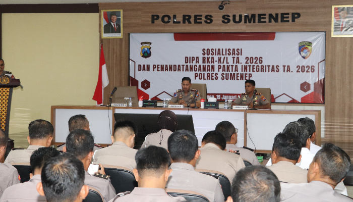 SUMENEP, Bongkar86.com – Kapolres Sumenep AKBP Anang Hardiyanto, S.I.K. memimpin kegiatan Sosialisasi Daftar Isian Pelaksanaan Anggaran (DIPA) Tahun Anggaran 2026 dan Penandatanganan Pakta Integritas TA 2026 yang digelar pada Senin, 19 Januari 2026, mulai pukul 09.00 WIB hingga selesai, bertempat di lingkungan Polres Sumenep.
