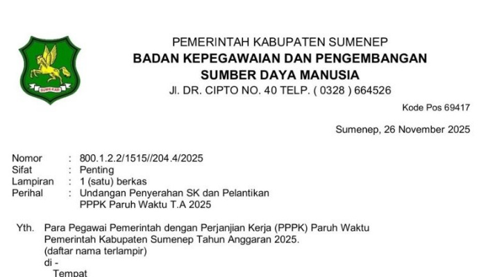 SUMENEP, Bongkar86.com – Pemerintah Kabupaten Sumenep melalui Badan Kepegawaian dan Pengembangan Sumber Daya Manusia (BKPSDM) mengumumkan perubahan lokasi pelantikan 5.226 Pegawai Pemerintah dengan Perjanjian Kerja (PPPK) Paruh Waktu Tahun