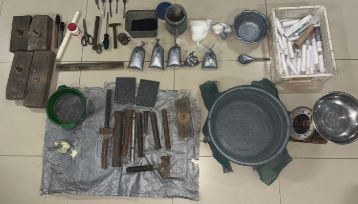 Dari hasil penggeledahan, petugas menemukan berbagai barang bukti berupa bahan peledak dan peralatan peracik, di antaranya beberapa sendok bengkok, gunting, obeng, palu, sumbu, bubuk serbuk berwarna silver dengan total berat beberapa ons, timbangan, serta berbagai alat lainnya yang digunakan untuk merakit bahan peledak.